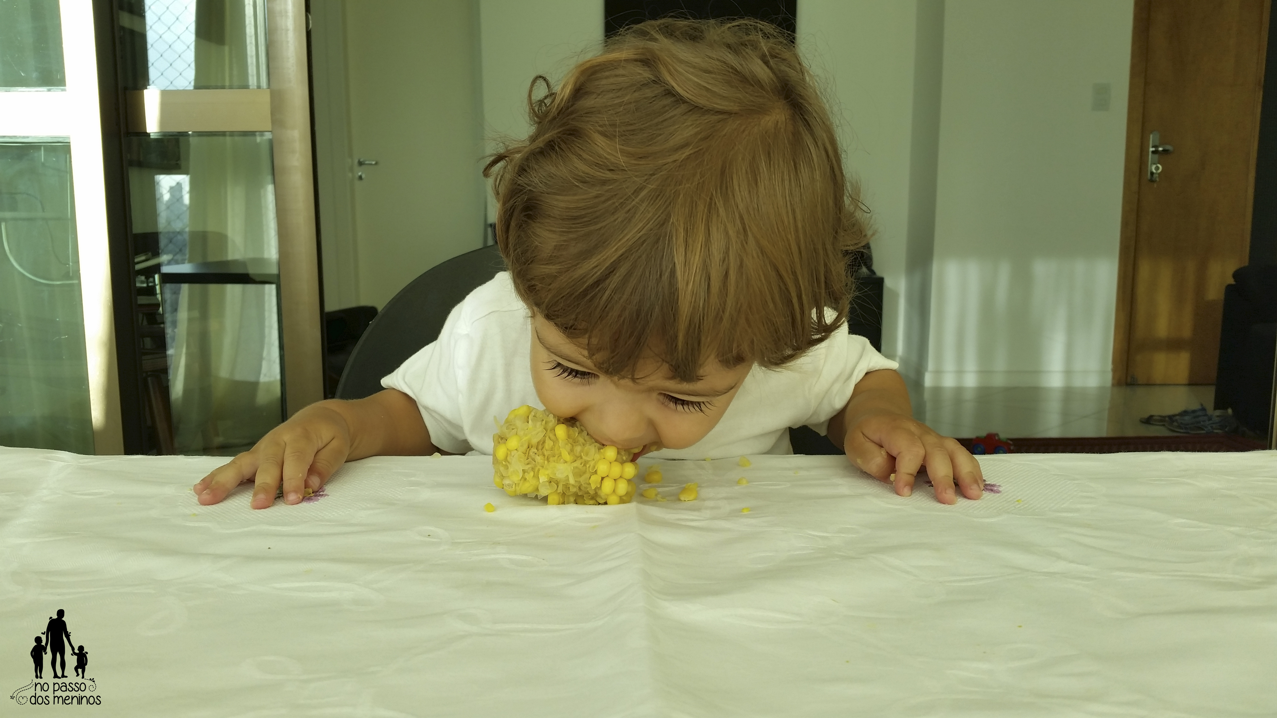 Dos 6 aos 10/11 meses espiga de milho era sinônimo de concentração e brincadeira, mas pouca coisa ia pra barriga. Lá pelas tantas Filipe descobriu que milho se comia e aí apaixonou-se. Hoje, aos 20 meses, sua capacidade de manipular a espiga está super desenvolvida e, quando fica cansado de segurá-la ele sempre arruma uma saída.