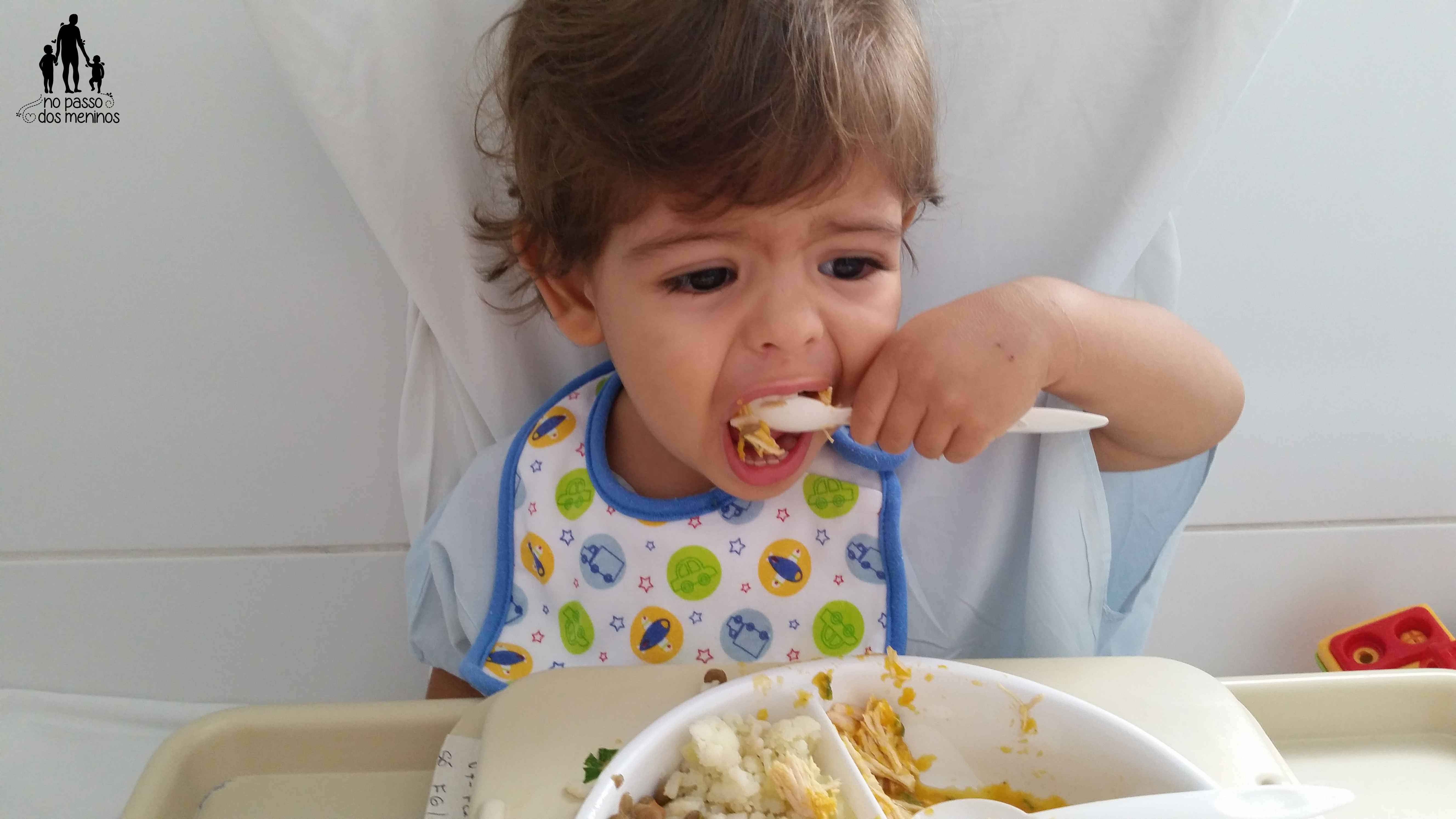Filipe desfrutando do almoço e aproveitando pra praticar as habilidades da mão esquerda uma vez que o acesso venoso estava na mão direita. O cardápio do dia era arroz integral, lentilha, couve-flor, frango com caldo de abóbora e purê de abóbora.