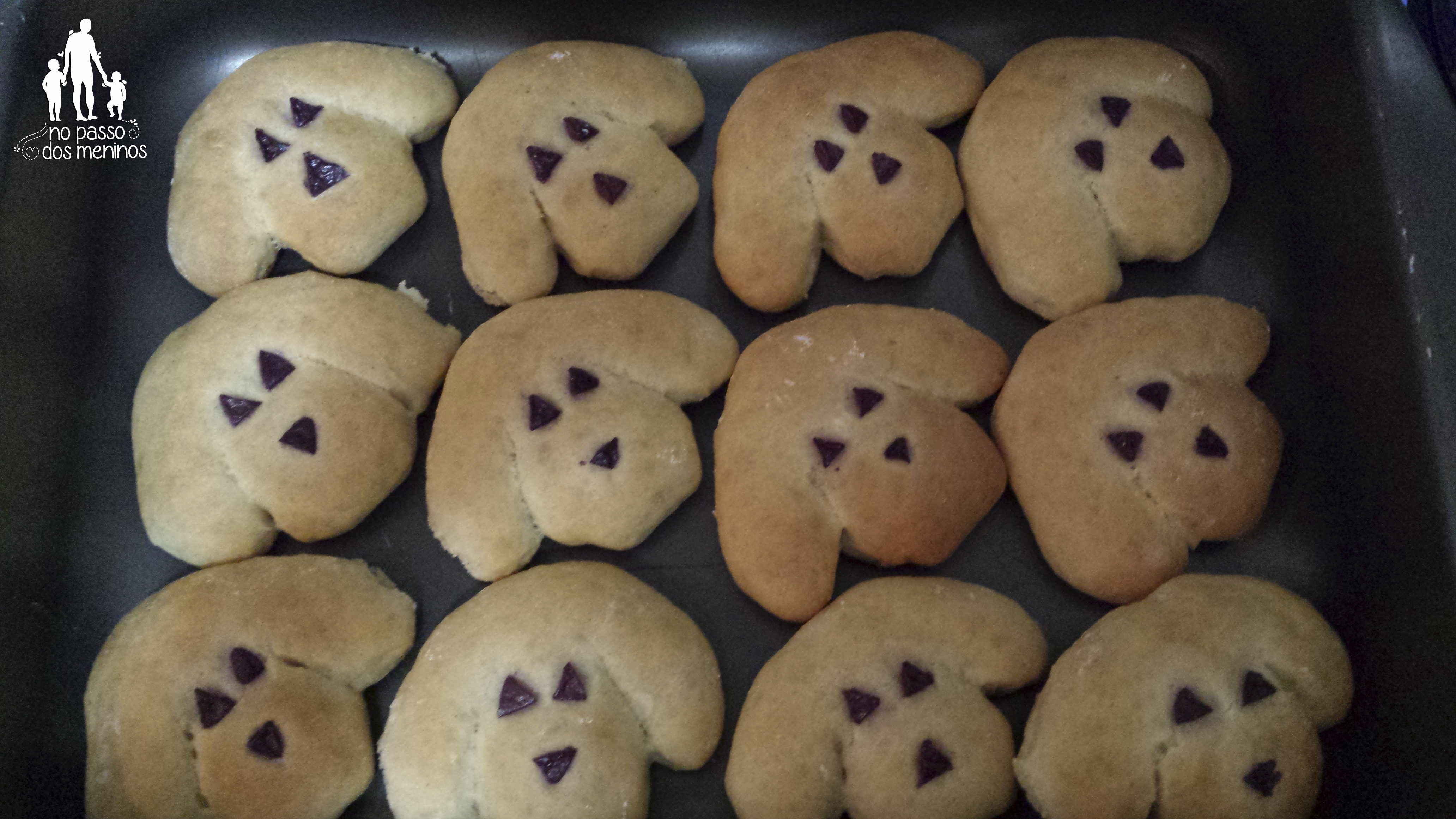 Faça bolinhas com toda a massa e depois molde os cachorrinhos: achate um pouco as bolinhas deixando-as ovais, corte as orelhas e coloque os olhos e focinho afundando com o cabo de uma colher. Deixe crescer novamente e asse em forne pré aquecido até corar.