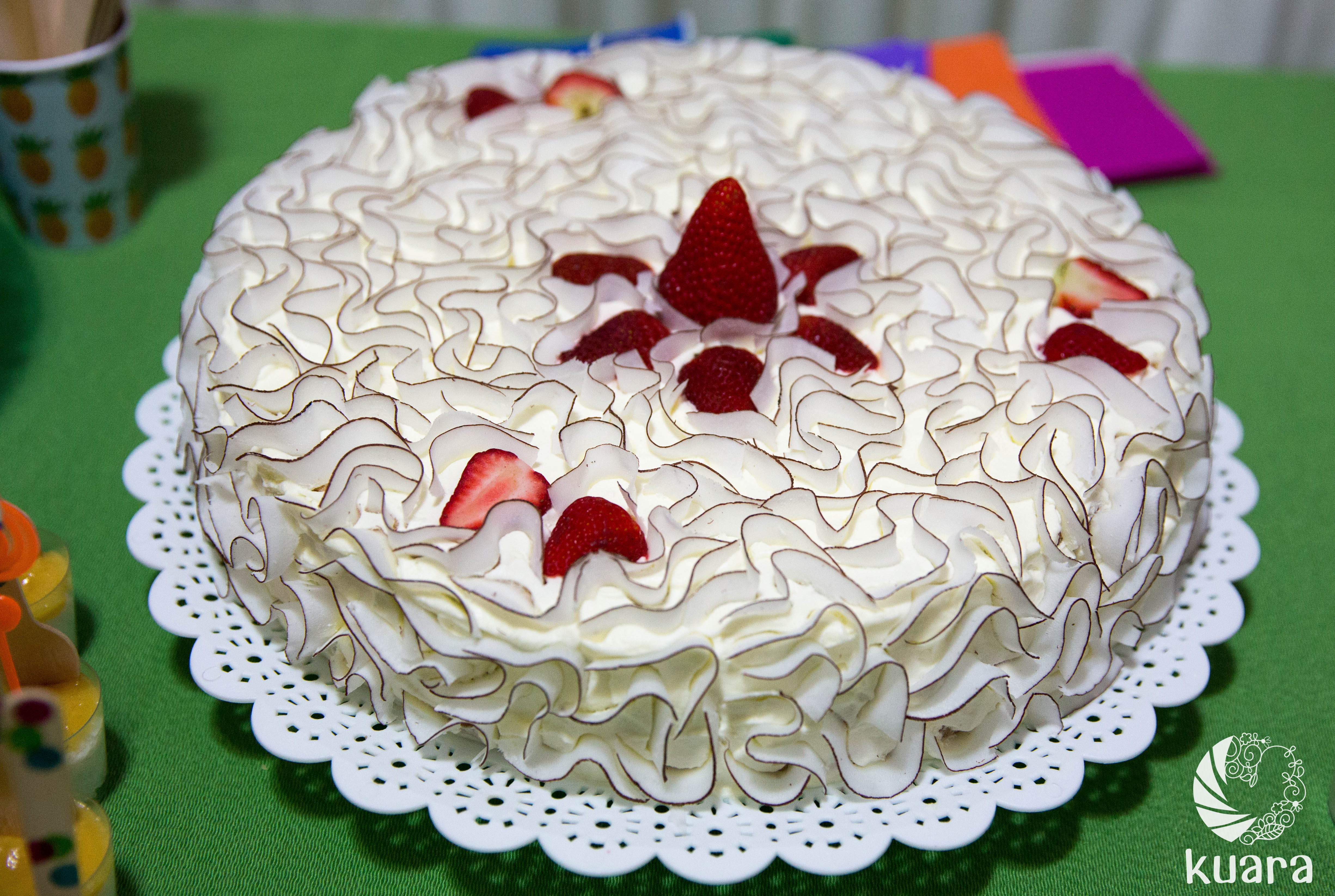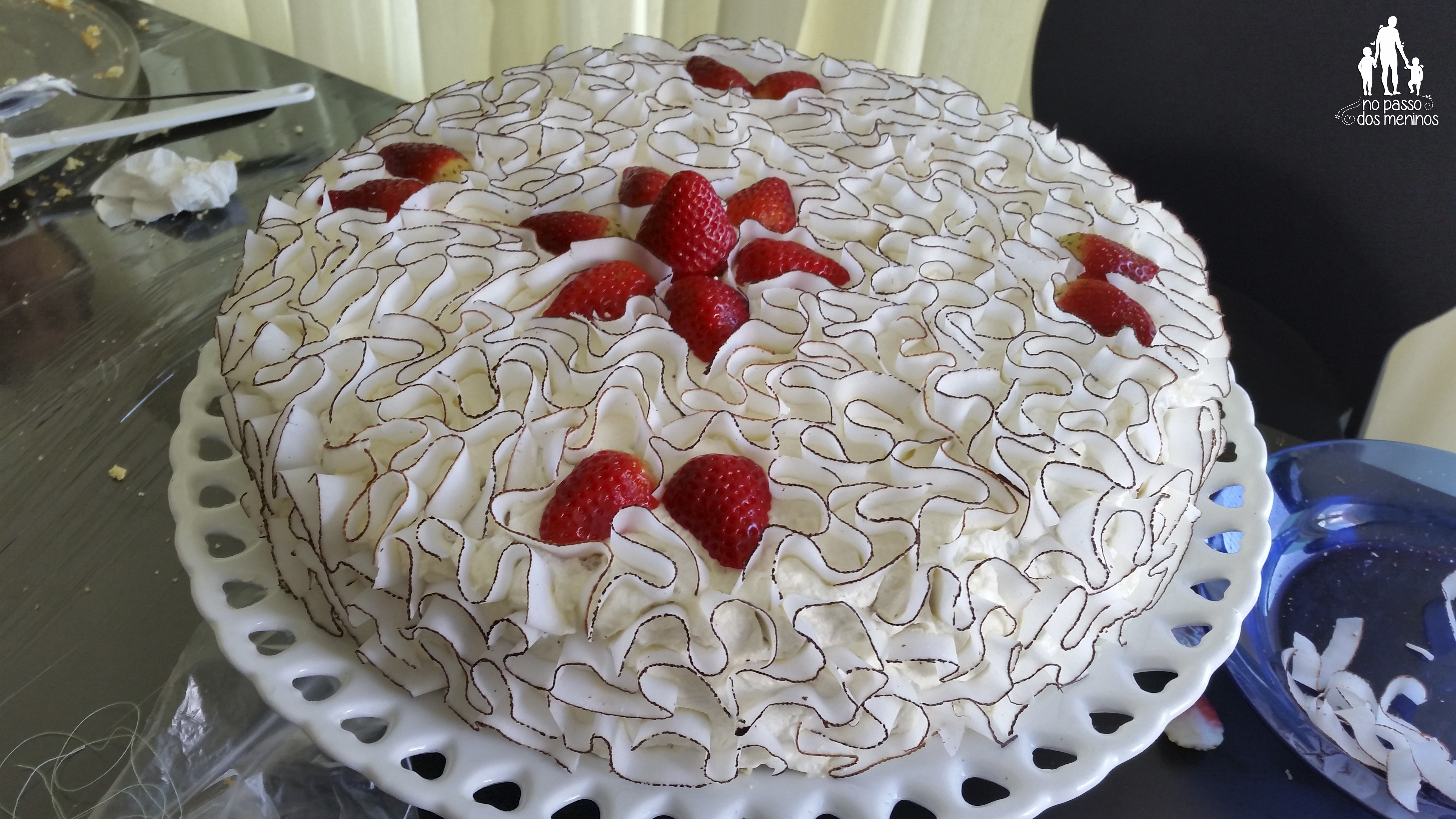 Sobre a terceira camada de bolo espalhe o chantily que esteve refrigerado, decore com morangos e use as fitas de coco para fazer uma renda. Se não tiver as fitas, use o coco ralado.