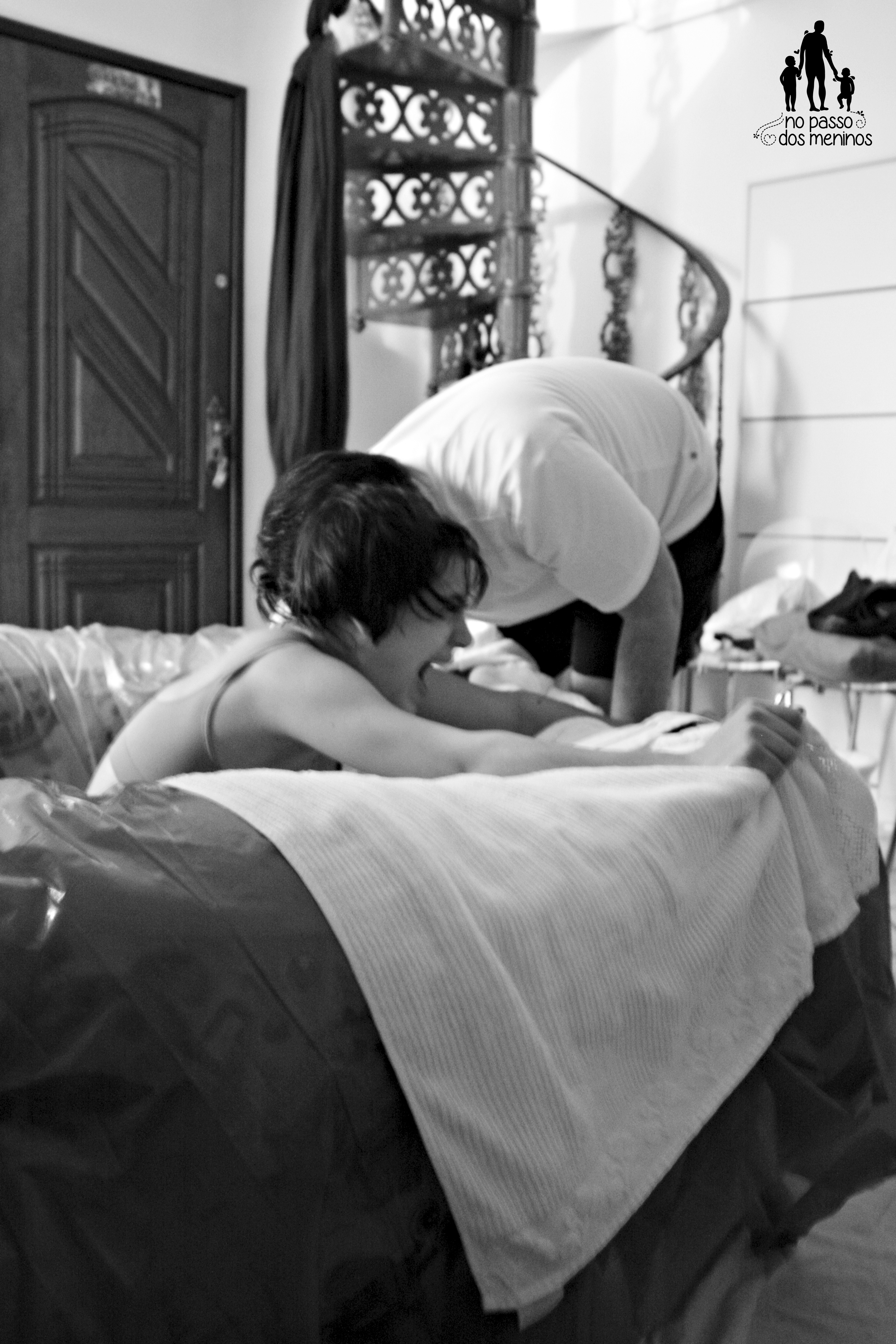 Volta e meia enxergava de relance meu marido ou alguém da equipe, mas durante essas 4 horas permaneci ajoelhada com a cabeça afundada numa toalha vocalizando, gemendo, gritando, me arrependendo por ter escolhido viver aquela dor ao mesmo tempo em que acreditava que aquele era o meu caminho.